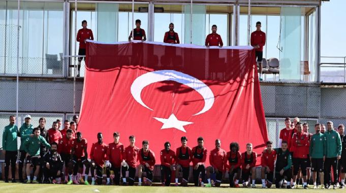 Kırmızı-beyazlı ekipte futbolcular ve teknik heyet, Cumhuriyet Bayramı dolayısıyla antrenmanda saha ortasında dev Türk bayrağı açarak poz verdi.