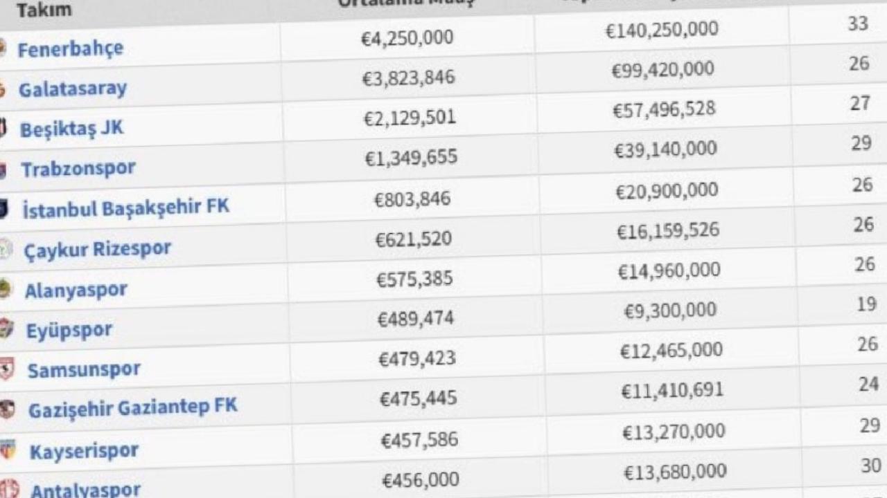 Üçüncü sıradaki Beşiktaş JK ise 27 futbolcu için toplam 57 milyon 496 bin euro maaş harcaması yaptı. Siyah beyazlıların oyuncu başına ortalama maaş ödemesi 2 milyon 129 bin euro olarak hesaplandı.