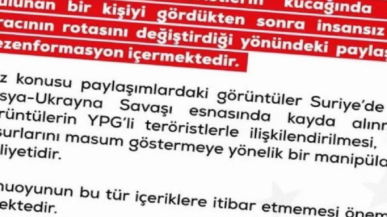 Bazı sosyal medya mecralarında "YPG'li teröristlerin kucağında çocuk bulunan bir kişiyi gördükten sonra insansız hava aracının rotasını değiştirdiği" iddiası ortaya atıldı.