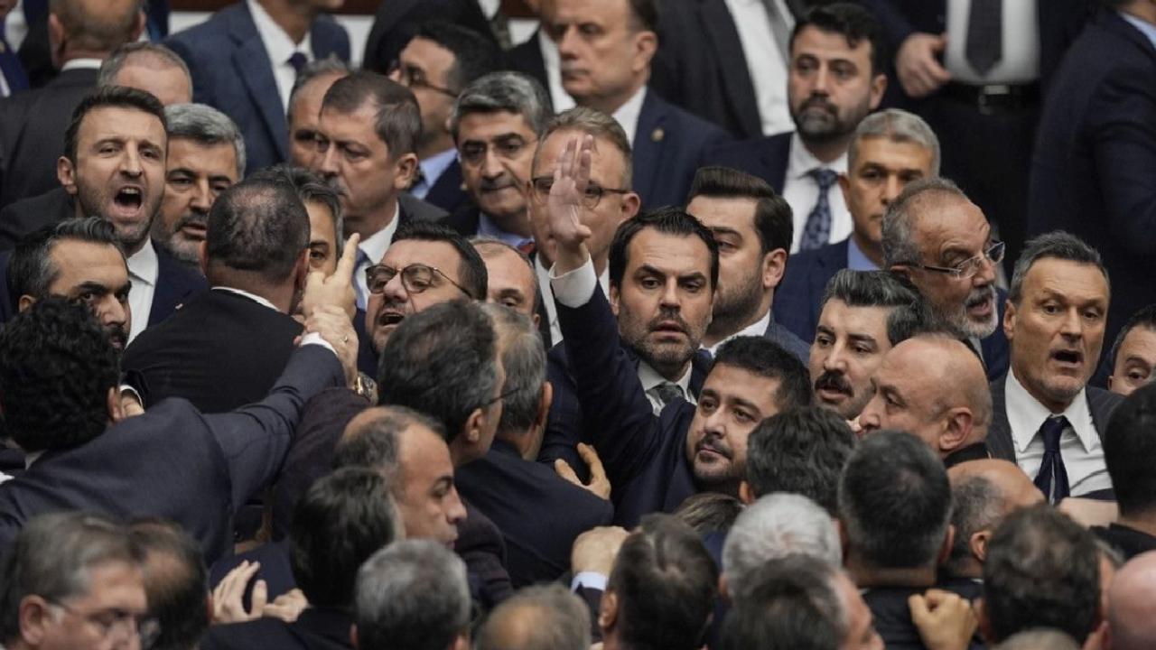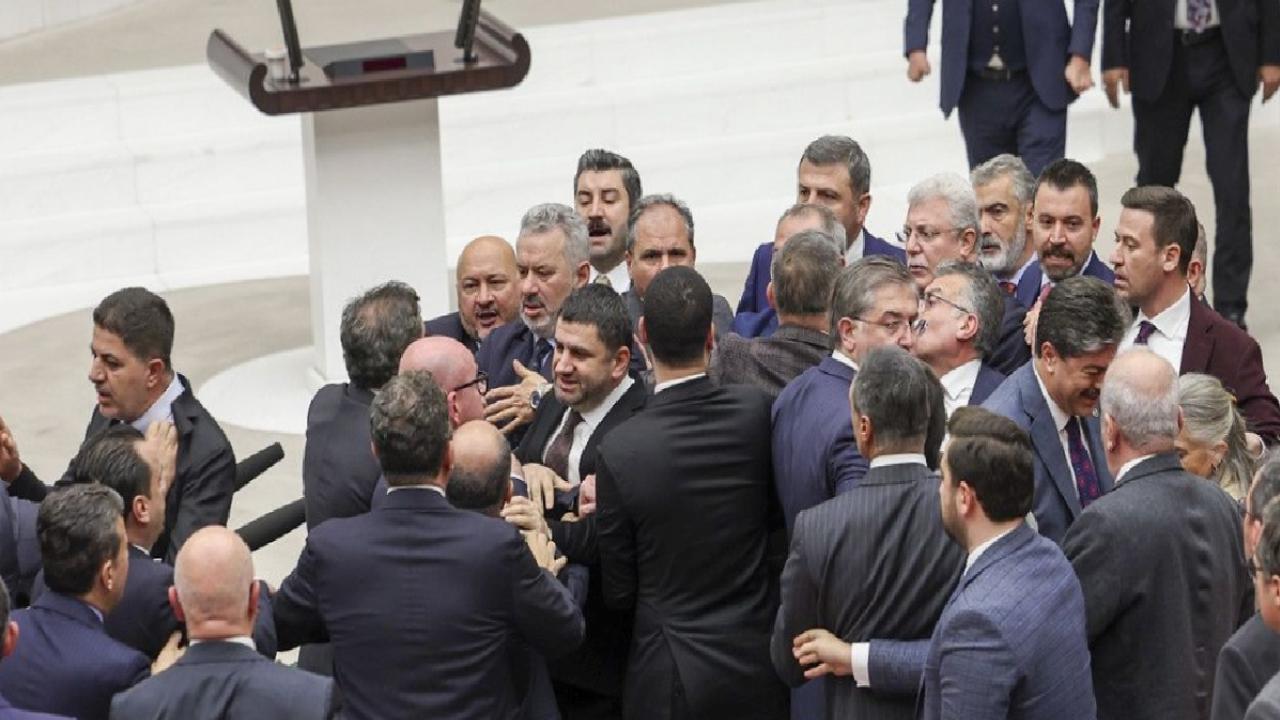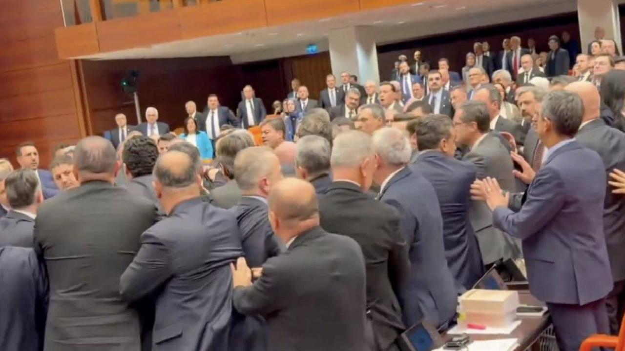 İki partinin sıralarından çok sayıda milletvekili kavgaya dahil oldu, salonun ortasında büyük bir arbede yaşandı.