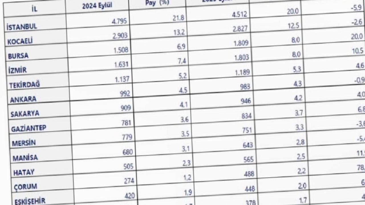 Tekirdağ ise 1 milyar 189 milyon dolarla beşinci sırada yer aldı.