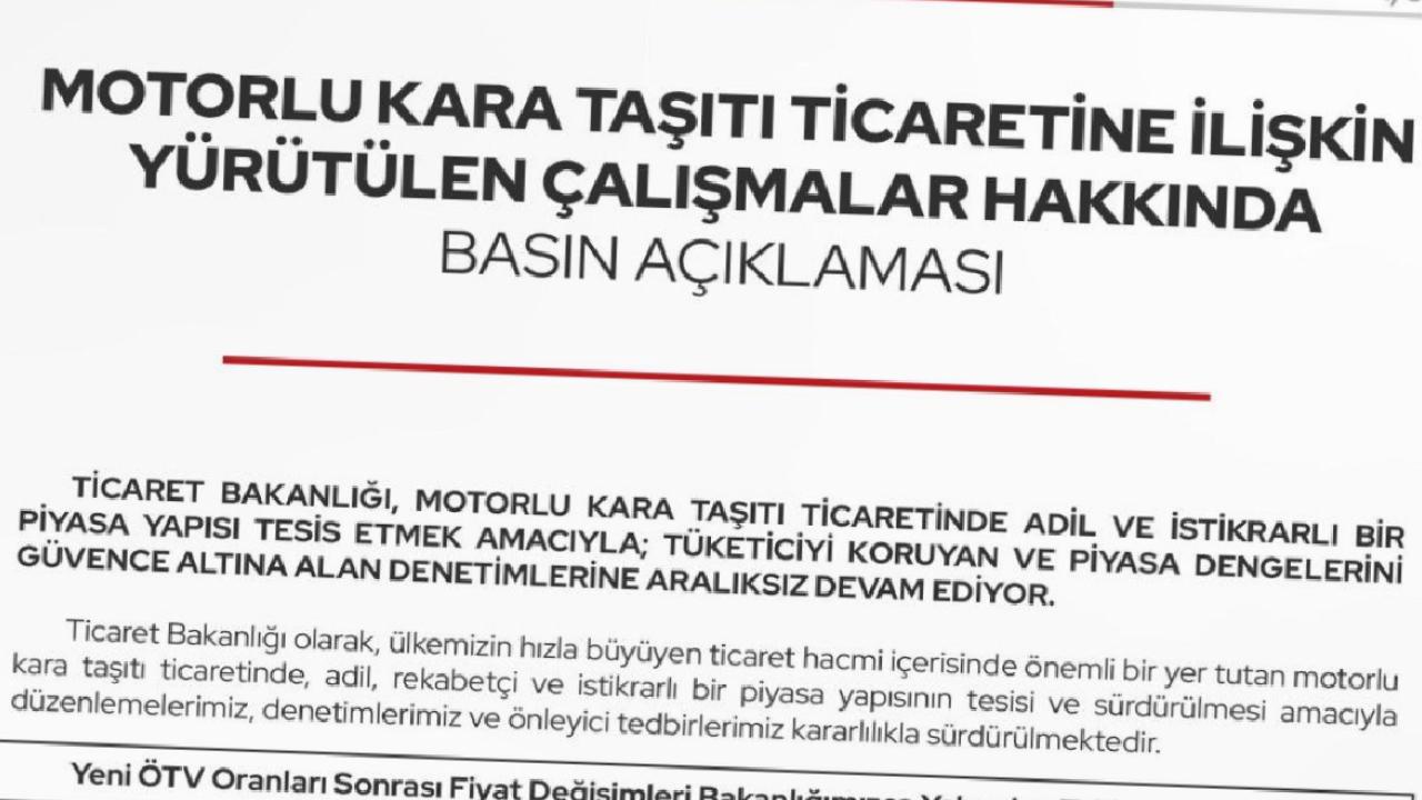 Ticaret Bakanlığı, araç ticaretine ilişkin bu düzenleme ve denetimlerin aynı kararlılıkla devam edeceğini ve vatandaşın lehine olan tüm tedbirlerin tavizsiz şekilde uygulanacağını vurguladı.