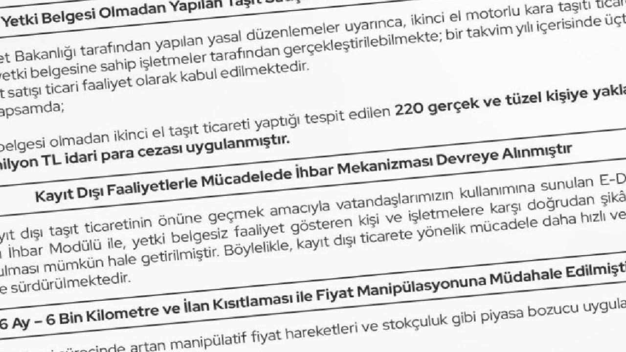 İkinci el araç satışlarında yaşanan fahiş fiyat artışları, yetki belgesi olmayan kişi ve kuruluşların yaptığı kayıt dışı faaliyetler ile tüketici aleyhine yürütülen uygulamalara karşı kapsamlı bir mücadele yürütülüyor.