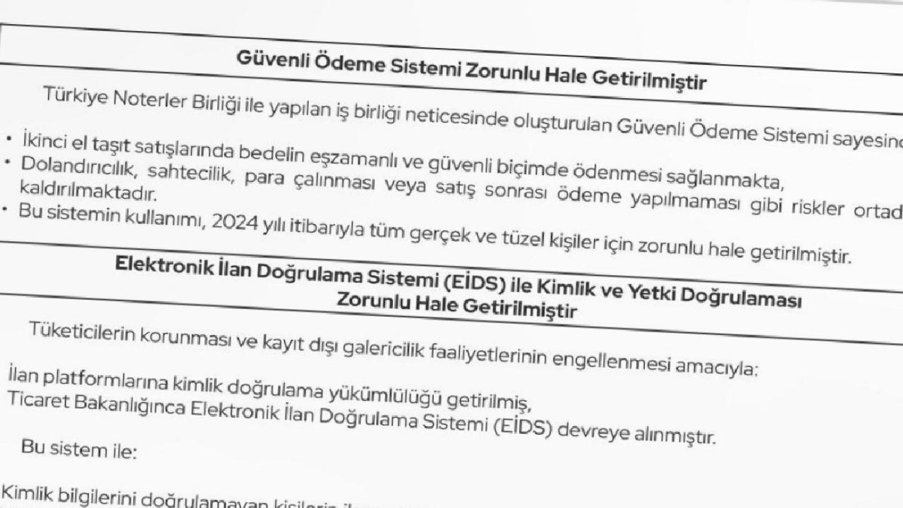 “Elektronik İlan Doğrulama Sistemi (EİDS)” adı verilen bu sistemle artık sadece araç sahibi, ikinci derece akrabası, eşi ya da yetkili işletmeler ilan verebilecek.