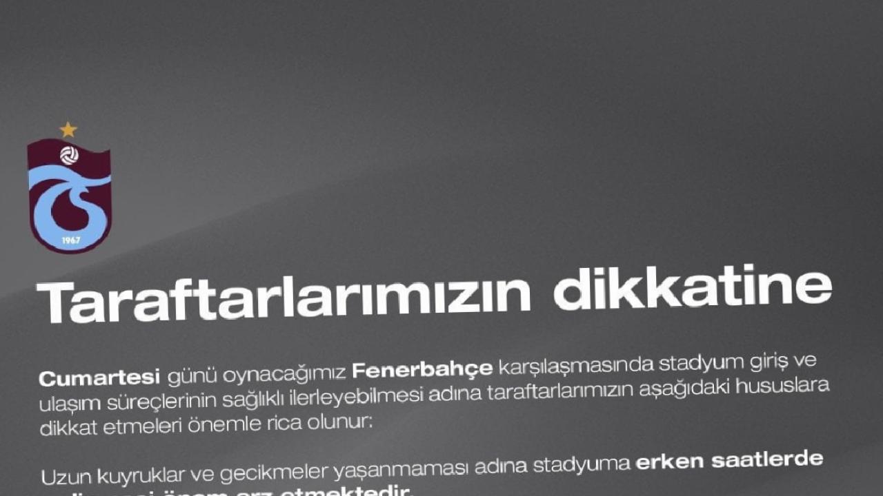 Bordo-mavili kulübün sosyal medya hesaplarından yapılan açıklamada, maça gidecek taraftarların stadyuma giriş ve ulaşım süreçlerinin sağlıklı ilerleyebilmesinin önemine işaret edildi.