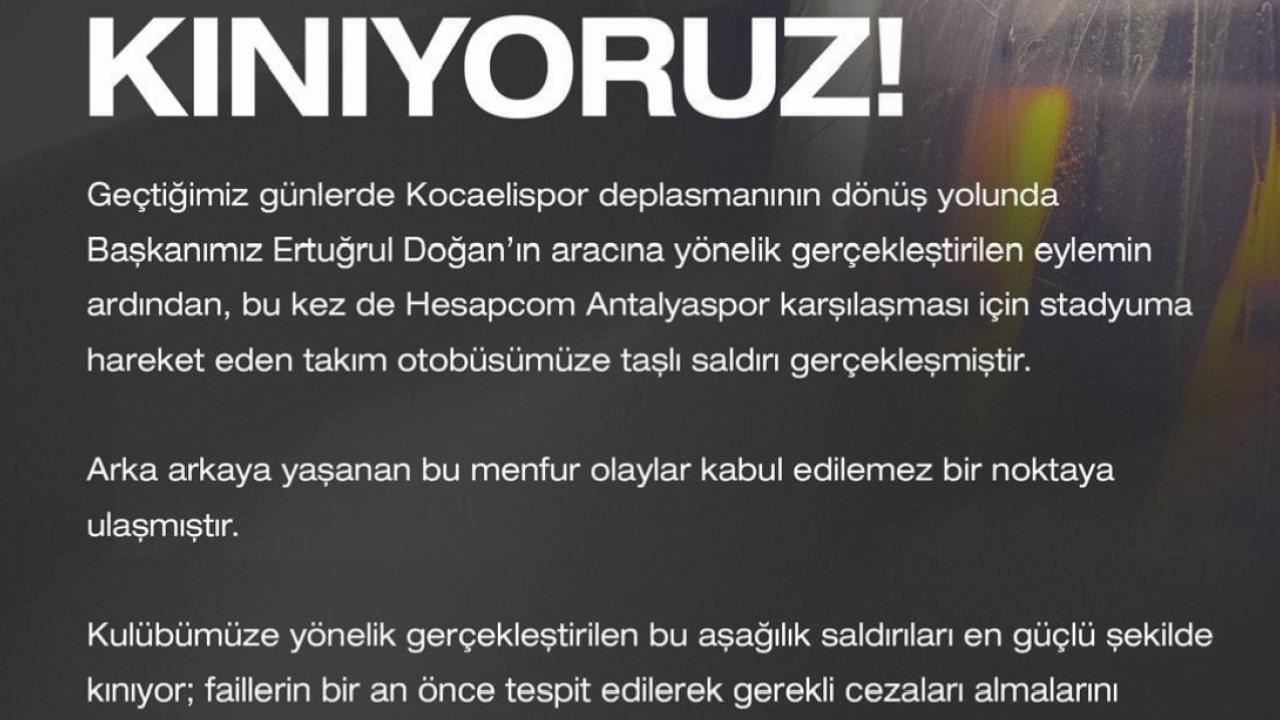 Geçtiğimiz günlerde Kocaelispor deplasmanının dönüş yolunda Başkanımız Ertuğrul Doğan’ın aracına yönelik gerçekleştirilen eylemin ardından, bu kez de Antalyaspor karşılaşması için stadyuma hareket eden takım otobüsümüze taşlı saldırı gerçekleşmiştir. Arka arkaya yaşanan bu menfur olaylar kabul edilemez bir noktaya ulaşmıştır. Kulübümüze yönelik gerçekleştirilen bu aşağılık saldırıları en güçlü şekilde kınıyor; faillerin bir an önce tespit edilerek gerekli cezaları almalarını bekliyoruz.