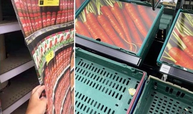 Müşterileri geri çevirmemek ve market raflarının boş görüntüsüne engel olmak isteyen bazı market zincirleri, rafların üstlerini ürünlerin görselleriyle kapladı.