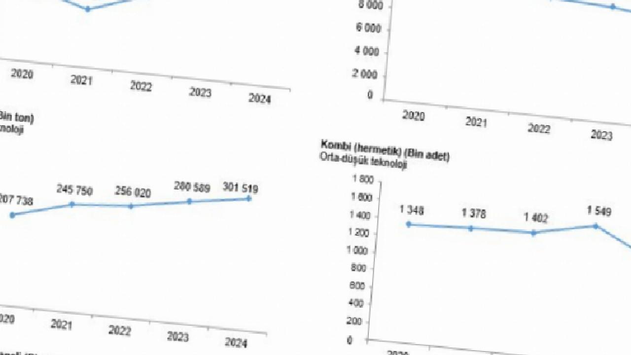 TÜİK'in açıkladığı 2024 yılına ilişkin Yıllık Sanayi Ürün (PRODCOM) İstatistikleri'nde üretimde öne çıkan ürünler arasında 1 milyon 169 bin 17 otomobil, 9 milyon 392 bin 251 ev tipi buzdolabı ve dondurucu, 301 milyon 519 bin 254 ton hazır beton, 1 milyon 204 bin 576 kombi, 34 milyon 810 bin 425 güneş pili ve paneli ile 1 milyon 14 bin 794 motosiklet yer aldı.