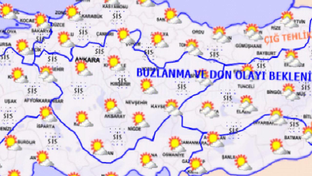 Kuzey, iç ve doğu bölgelerde buzlanma ve don olayı ile birlikte pus ve yer yer sis bekleniyor. Doğu Karadeniz’in iç kesimlerinin yüksekleri ile Doğu Anadolu’nun yüksek kar örtüsüne sahip eğimli kesimlerinde çığ ve kar erimesi tehlikesi bulunmaktadır.