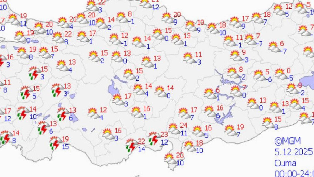Bugün ülke genelinde parçalı bulutlu hava hakim olurken Marmara'nın doğusu, Kuzey Ege, İç Anadolu'nun büyük kısmı, Karadeniz, Doğu Anadolu, Kahramanmaraş, Osmaniye, Hatay ve Siirt çevreleri ile Adana'nın doğu kesimleri yağış alacak.