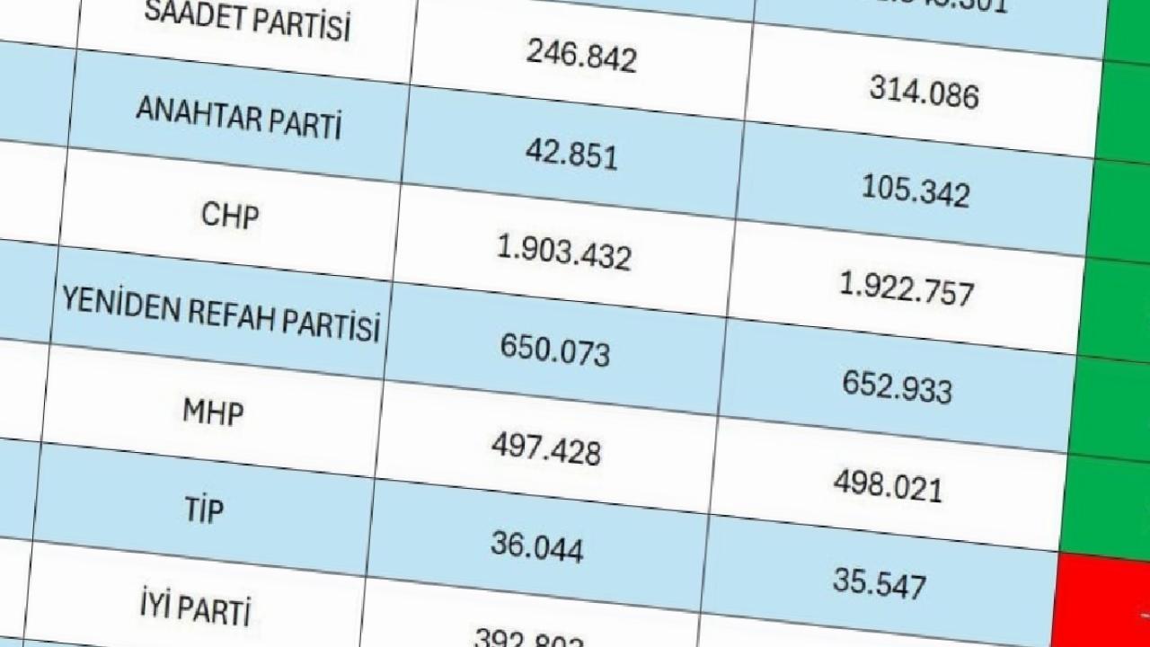 Anahtar Parti 105 bin 342, Anavatan Partisi 22 bin 517, Gelecek Partisi 60 bin 494, Türkiye İşçi Partisi 35 bin 547, Türkiye Komünist Partisi 7 bin 9, Vatan Partisi 12 bin 311, Zafer Partisi 71 bin 84, Demokratik Sol Parti 22 bin 763, Hür Dava Partisi 15 bin 949, Bağımsız Türkiye Partisi 14 bin 450.