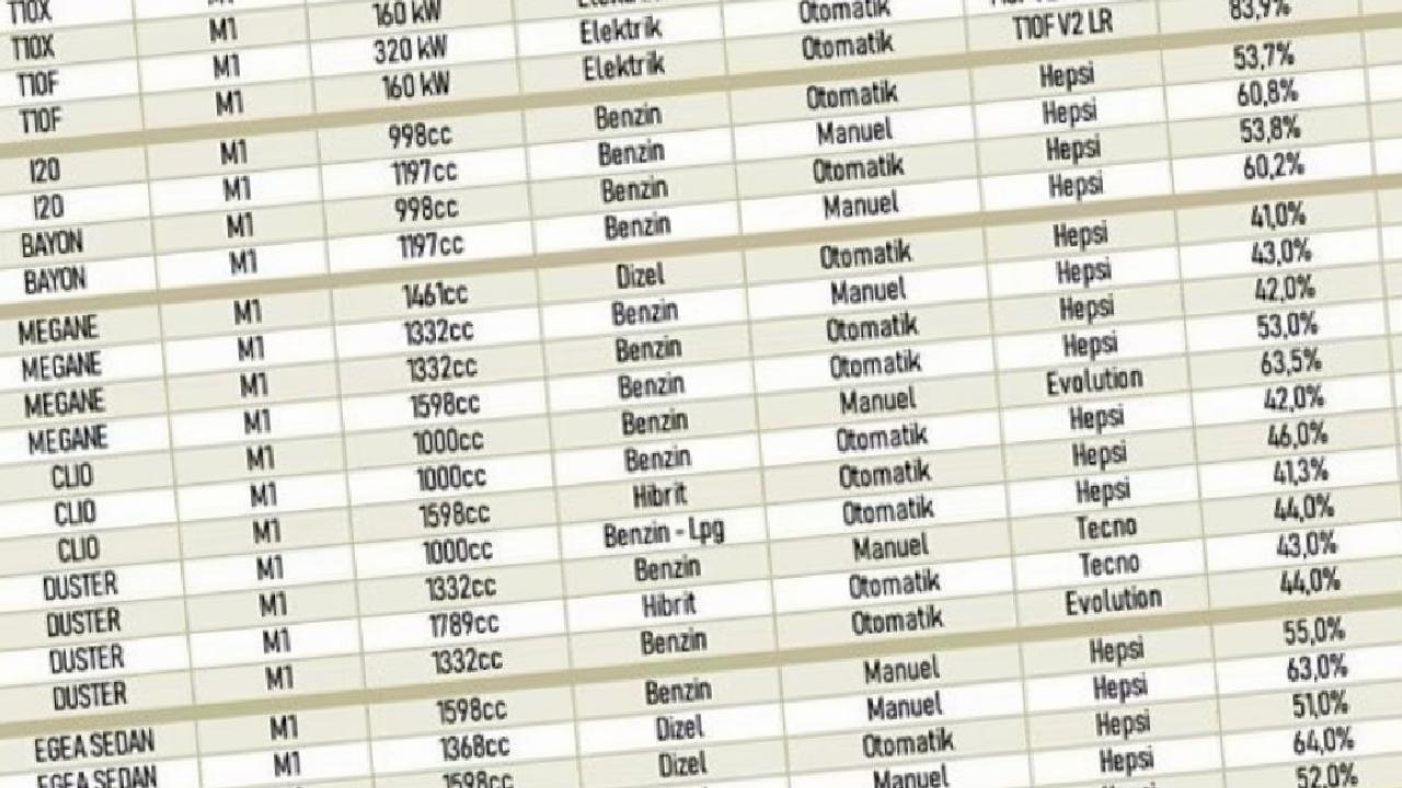 Üretimi biten Hyundai i10 listeden çıkarılırken; Fiat Egea, Renault Megane ve Toyota C-HR gibi popüler modeller için yeniden beyan verilmediği dikkat çekti.