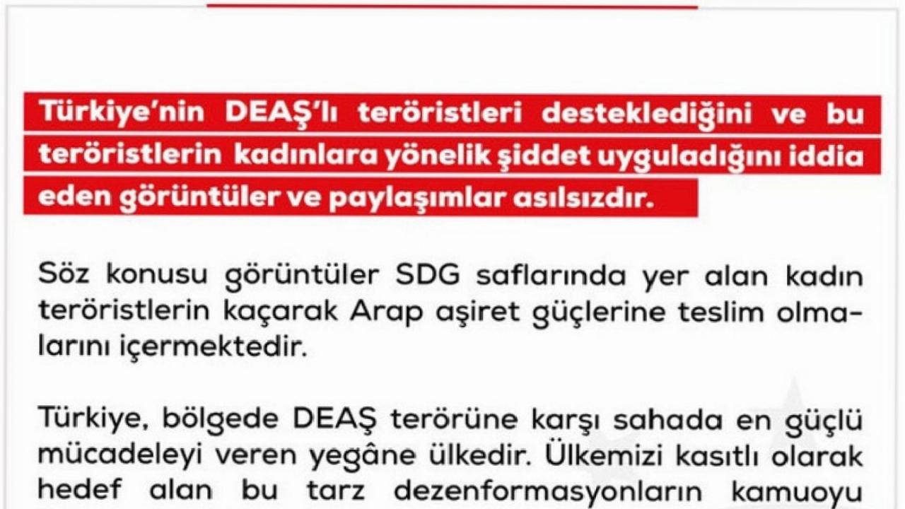 "Türkiye'nin DEAŞ'lı teröristleri desteklediğini ve bu teröristlerin kadınlara yönelik şiddet uyguladığını iddia eden görüntüler ve paylaşımlar asılsızdır. Söz konusu görüntüler, SDG saflarında yer alan kadın teröristlerin kaçarak Arap aşiret güçlerine teslim olmalarını içermektedir. Türkiye, bölgede DEAŞ terörüne karşı sahada en güçlü mücadeleyi veren yegane ülkedir. Ülkemizi kasıtlı olarak hedef alan bu tarz dezenformasyonların kamuoyu tarafından dikkate alınmaması rica olunur."