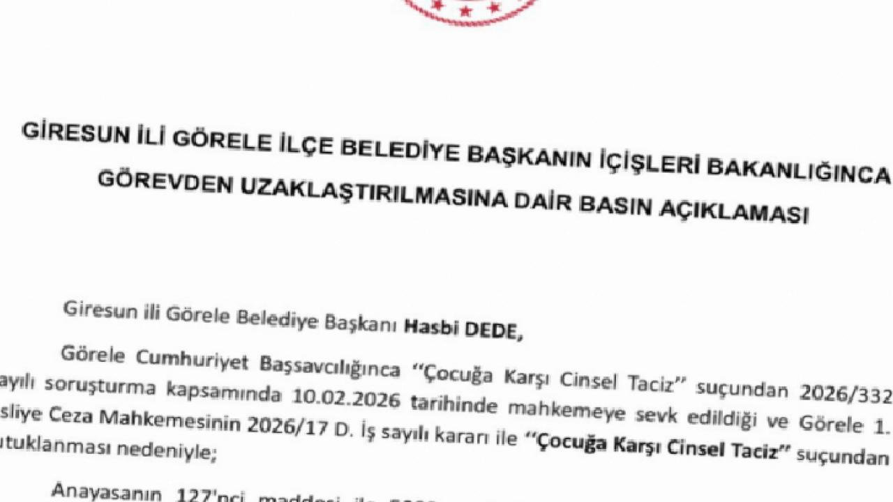 ANKARA () - Giresun’un Görele ilçesinde CHP'li Belediye Başkanı Hasbi Dede (43), Görele Cumhuriyet Başsavcılığı tarafından yürütülen “Çocuğa Karşı Cinsel Taciz” soruşturması kapsamında 10 Şubat 2026 tarihinde mahkemeye sevk edildi.