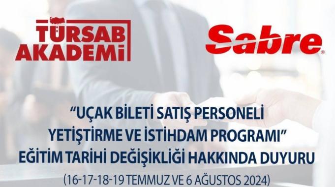 TÜRSAB tarafından yapılan açıklamada, “Seyahat acentalarının bilet departmanlarında yaşanan personel ihtiyacı nedeniyle TÜRSAB Havayolu Bilet Satış ve IATA İhtisas Başkanlığı, SABRE ve TÜRSAB Akademi iş birliği ile TÜRSAB Akademi çatısı altında sektöre nitelikli personel kazandırmaya yönelik “Uçak Bileti Satış Personeli (Seyahat Danışmanı) Yetiştirme Programı” düzenlenecek. SABRE iş birliği ile gerçekleştirilecek olan programa rezervasyon ve biletleme alanında uzmanlaşmak isteyen, turizm mezunu önlisans ve tüm lisans ve yüksek lisans mezunları başvurabilecektir. Eğitimler İstanbul TÜRSAB Genel Merkez Binası’nda yüzyüze gerçekleştirilecektir” denildi.