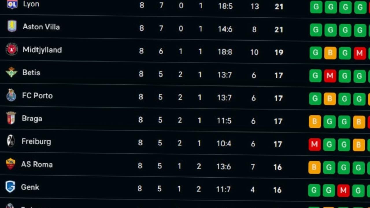 Lig etabının sona ermesinin ardından ilk 8'de yer alan Olimpik Lyon, Aston Villa, Midtjylland, Real Betis, Porto, Braga, Freiburg ve Roma, ilk 8'de yer alarak doğrudan son 16 turuna yükseldi.