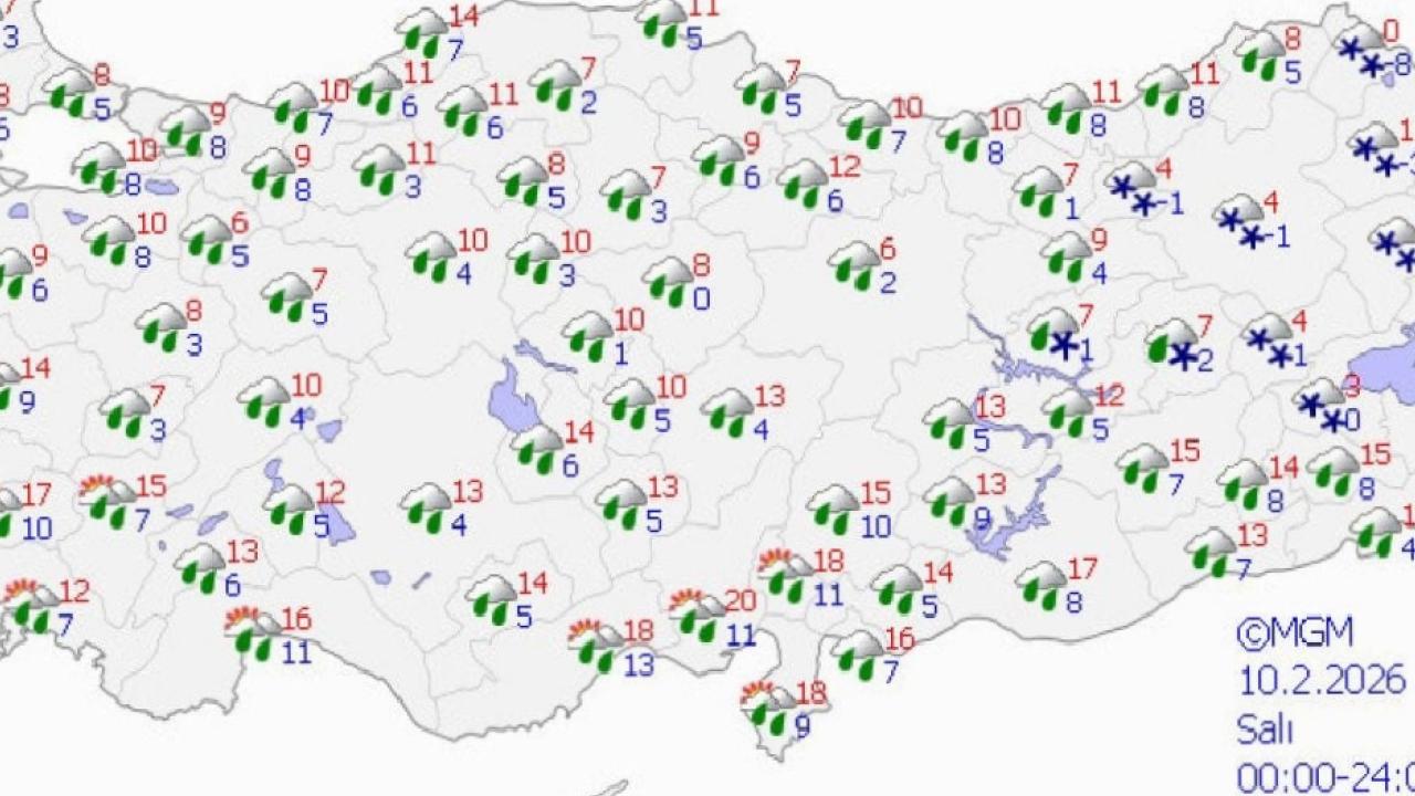 Salı günü ülkenin büyük bölümünde parçalı bulutlu hava, yer yer hafif yağmur veya karla karışık yağışın devam etmesi bekleniyor.
