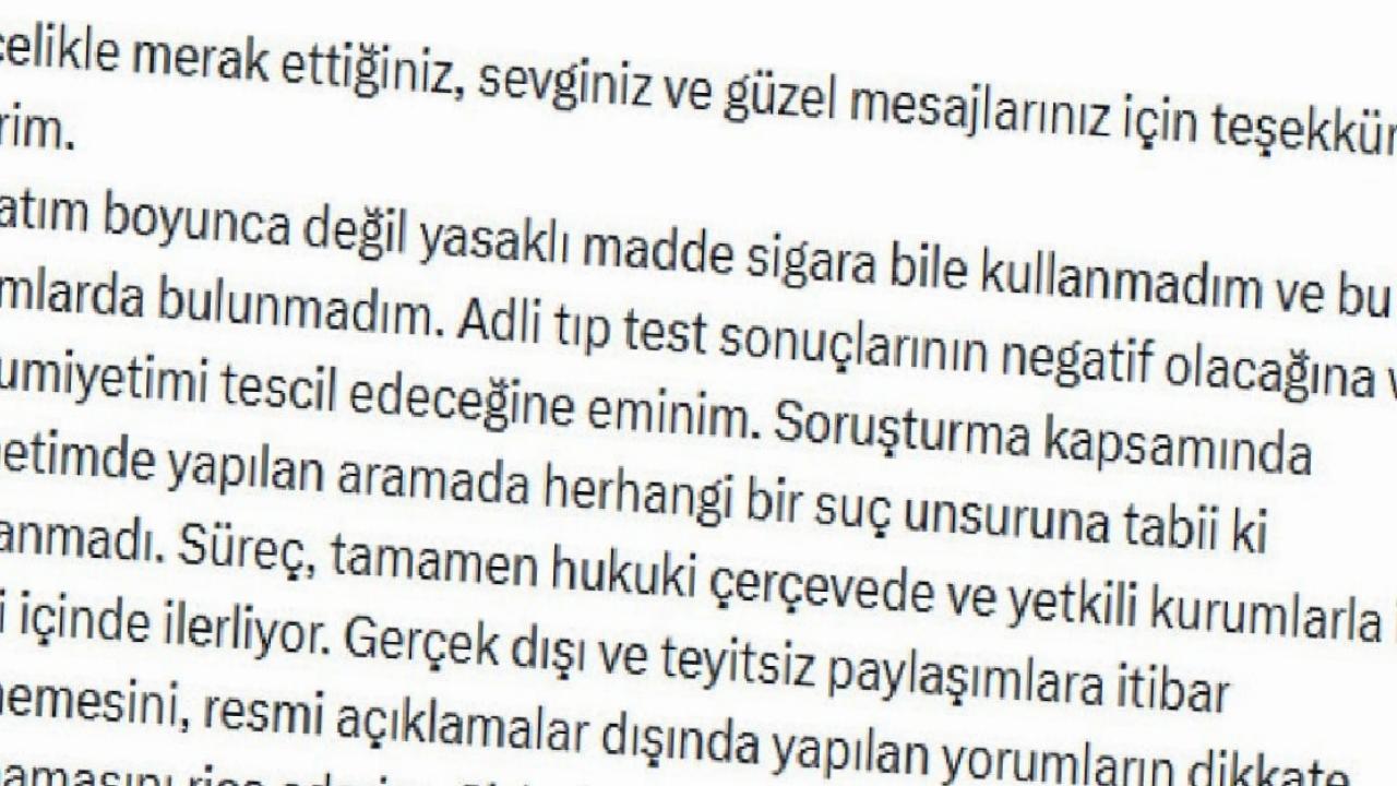 Hayatım boyunca değil yasaklı madde sigara bile kullanmadım ve bu tarz ortamlarda bulunmadım. Adli tıp test sonuçlarının negatif olacağına ve masumiyetimi tescil edeceğine eminim. Soruşturma kapsamında ikametimde yapılan aramada herhangi bir suç unsuruna tabii ki rastlanmadı. Süreç, tamamen hukuki çerçevede ve yetkili kurumlarla iş birliği içinde ilerliyor.