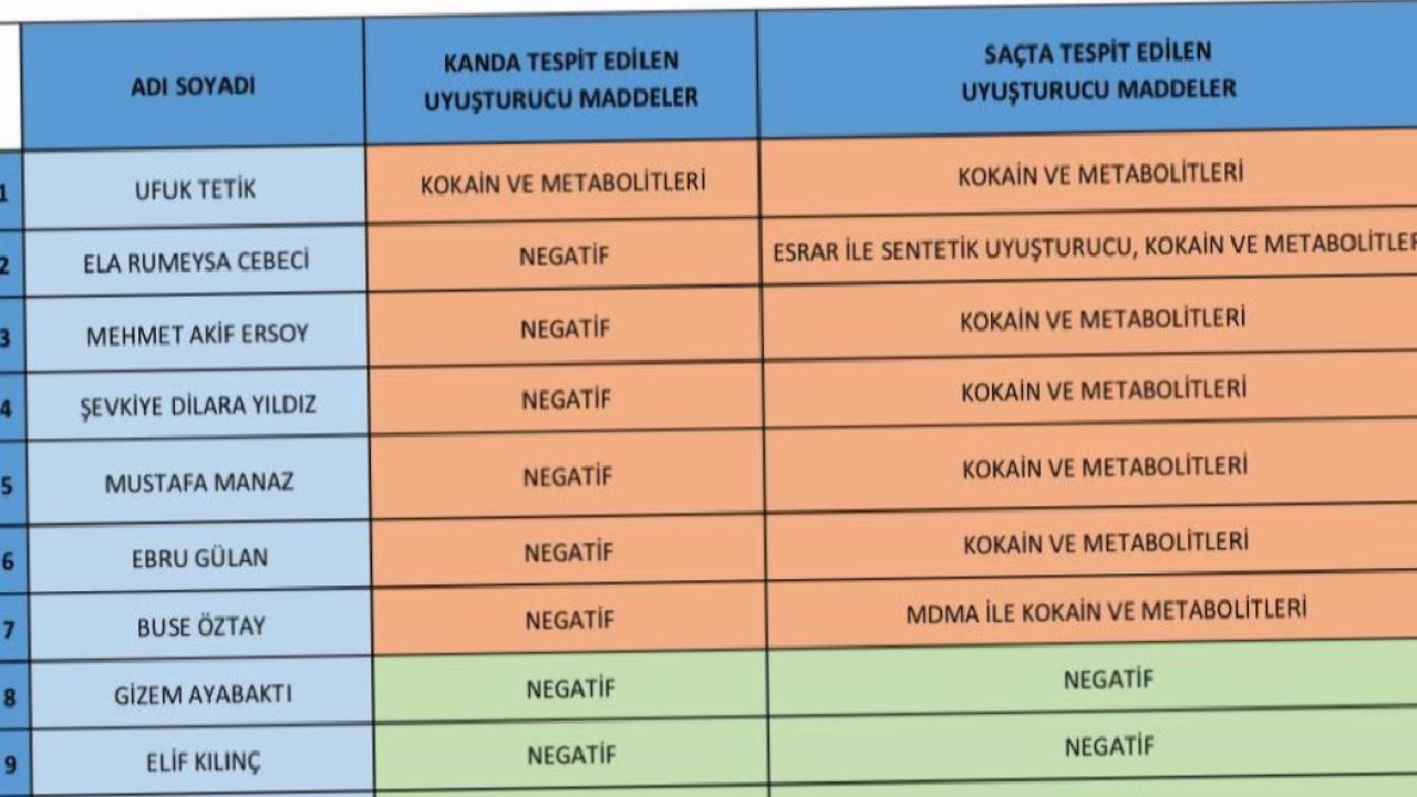 Adli Tıp raporlarına göre, pozitif çıkan örneklerde “kokain ve metabolitleri” tespit edildi. Üç şüphelinin ise test sonuçlarının negatif olduğu belirtildi.