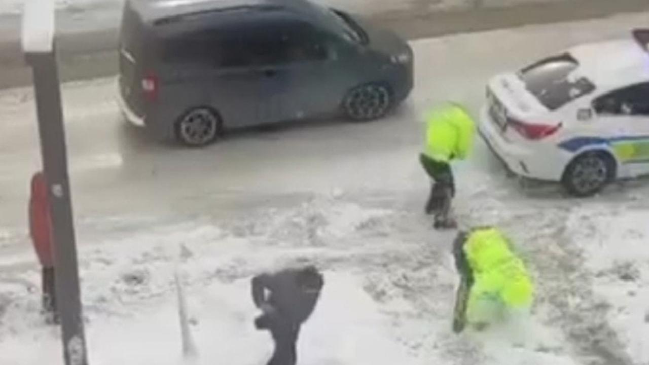 Kartopu oynayan polisler, çocukların neşesine ortak olurken ortaya samimi ve tebessüm ettiren kareler çıktı.