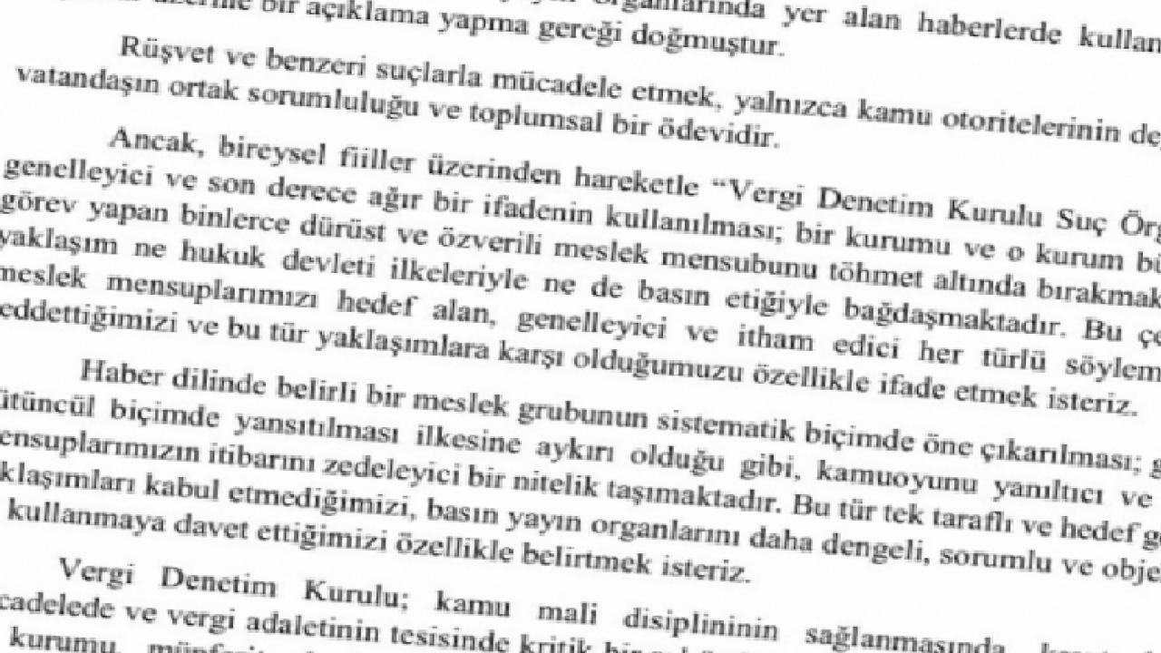 Vergi Denetim Kurulu’nun kamu mali disiplininin sağlanması, kayıt dışılıkla mücadele ve vergi adaletinin tesisinde kritik bir rol üstlendiği hatırlatılan açıklamada, münferit olaylar üzerinden kurumsal itibarı zedeleyici genellemelerin kabul edilemeyeceği kaydedildi.