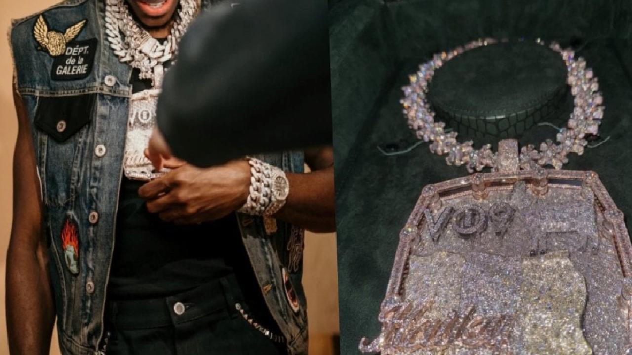 Kolyede, Nijerya bayrağının renkleri, “VO9” baş harfleri ve “GOAT” (Tüm Zamanların En İyisi) ifadesini simgeleyen bir figür yer alıyor.