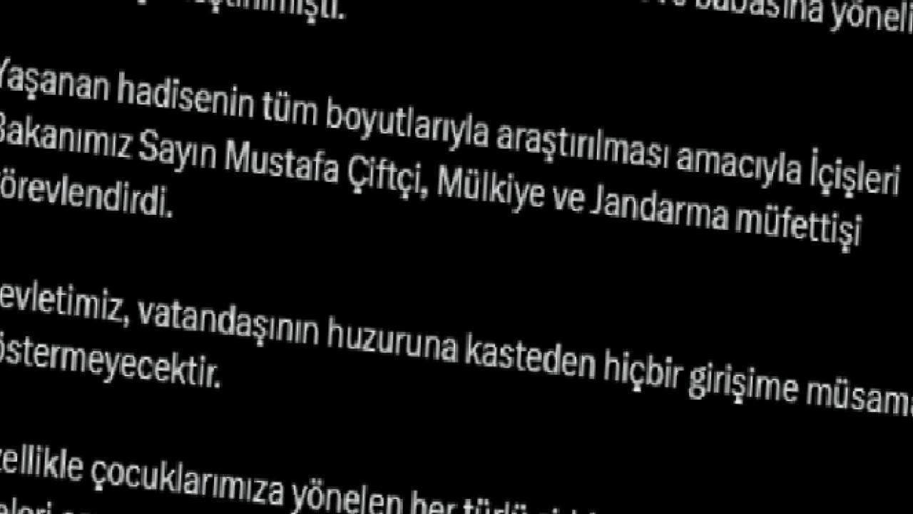 Bakanlık, vatandaşların huzur ve güvenliğine yönelik hiçbir girişime müsamaha gösterilmeyeceğini vurgulayarak, özellikle çocuklara yönelik şiddetin karşısında hukuk devleti ilkeleri çerçevesinde en güçlü şekilde durulacağını ifade etti.