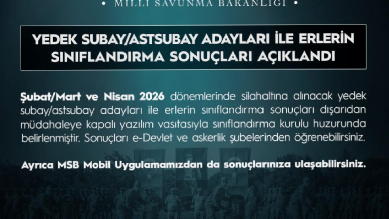 ANKARA () - Milli Savunma Bakanlığı (MSB), 2026 yılı Şubat, Mart ve Nisan celp dönemlerinde silahaltına alınacak yedek subay, yedek astsubay adayları ile erlerin sınıflandırma sonuçlarının belirlendiğini açıkladı.