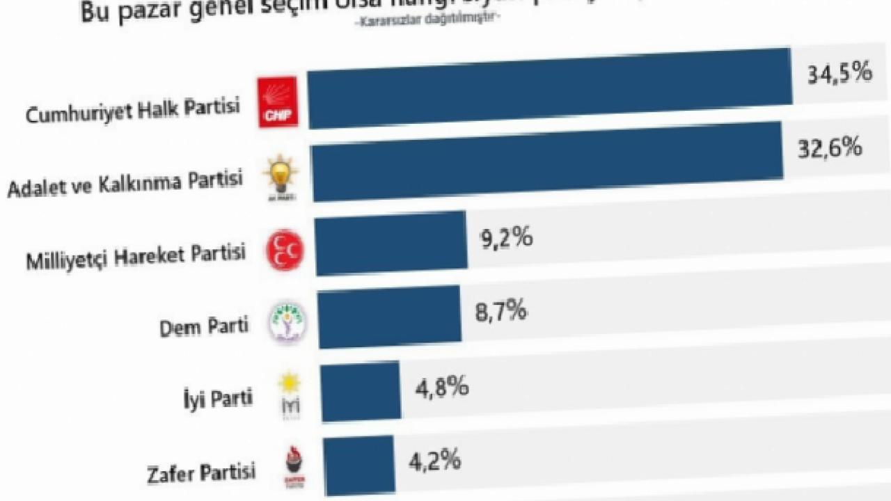 Anket sonuçlarına göre CHP, önceki ölçümlere kıyasla oy oranını 1,7 puan artırarak yüzde 34,5'e ulaştı. AK Parti ise yüzde 32,6 oy oranıyla ikinci sırada yer aldı. İki parti arasındaki farkın yaklaşık 2 puan olduğu görüldü.
