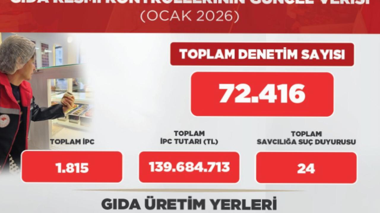 Bu kapsamda ocak ayı boyunca toplam 72 bin 416 resmi gıda kontrolü gerçekleştirildi. Denetimler sonucunda mevzuata aykırı faaliyet gösterdiği tespit edilen 1.815 işletmeye idari para cezası uygulanırken, kesilen cezaların toplam tutarının 139 milyon 684 bin 713 TL olduğu bildirildi.