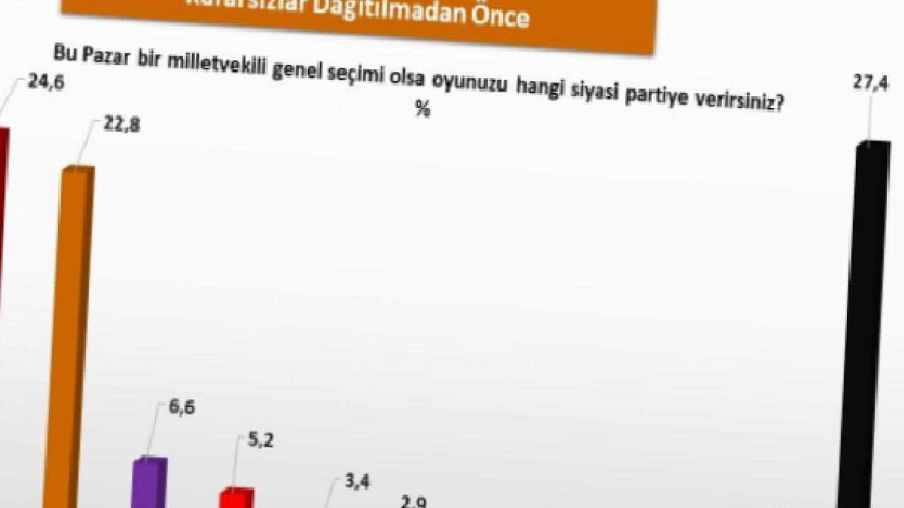 Ankette ilk sırayı yüzde 27,4 ile "Kararsız/Oy kullanmam" diyenler alırken, CHP yüzde 24,6 ile ikinci, AK Parti ise yüzde 22,8 ile üçüncü sırada yer aldı.