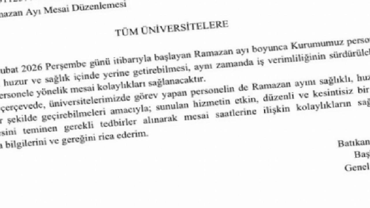 Yetkililer, Ramazan boyunca çalışanların motivasyonunu ve verimliliğini destekleyecek bu düzenlemenin, üniversitelerde hizmet kalitesinin korunarak uygulanacağını belirtti.