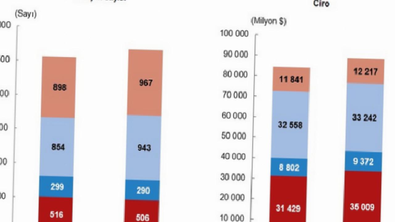 Sanayi girişimleri 35 milyar 9 milyon dolar ciro elde ederken, ticaret 33 milyar 242 milyon dolar, hizmet 12 milyar 217 milyon dolar ve inşaat 9 milyar 372 milyon dolar ciro sağladı. Sektörel dağılıma göre 967 girişim hizmet, 943 girişim ticaret, 506 girişim sanayi ve 290 girişim inşaat alanında faaliyet gösteriyor.