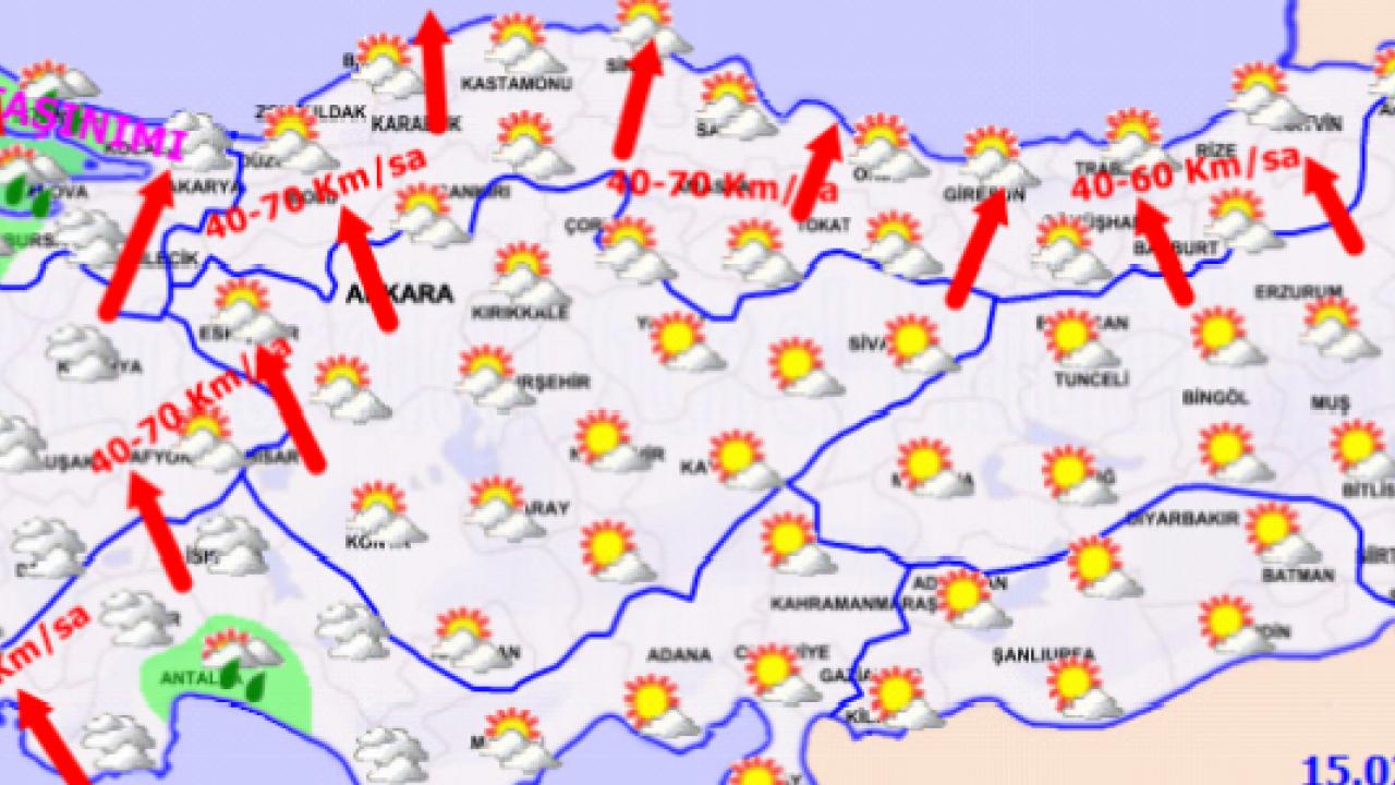 Rüzgârın ise genellikle güneyli yönlerden eseceği, Marmara, Ege, Batı Akdeniz, İç Anadolu’nun batısı ve Karadeniz’de kuvvetli ve kısa süreli fırtına (40-70 km/saat) şeklinde etkili olacağı açıklandı. Çatı uçması, ağaç devrilmesi ve ulaşımda aksamalar gibi risklere karşı tedbir çağrısı yapıldı.