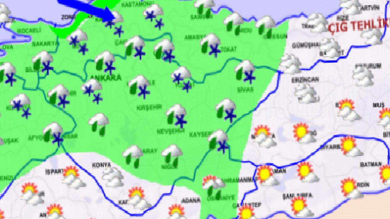Samsun’un doğusu, Ordu, Giresun, Trabzon, Rize ve Artvin’de kuvvetli sağanak; İç Anadolu’nun doğusu, Orta ve Doğu Karadeniz’in yüksekleri, Doğu Anadolu’nun batısı ve Adıyaman’ın kuzey kesimlerinde ise kuvvetli kar yağışı bekleniyor.