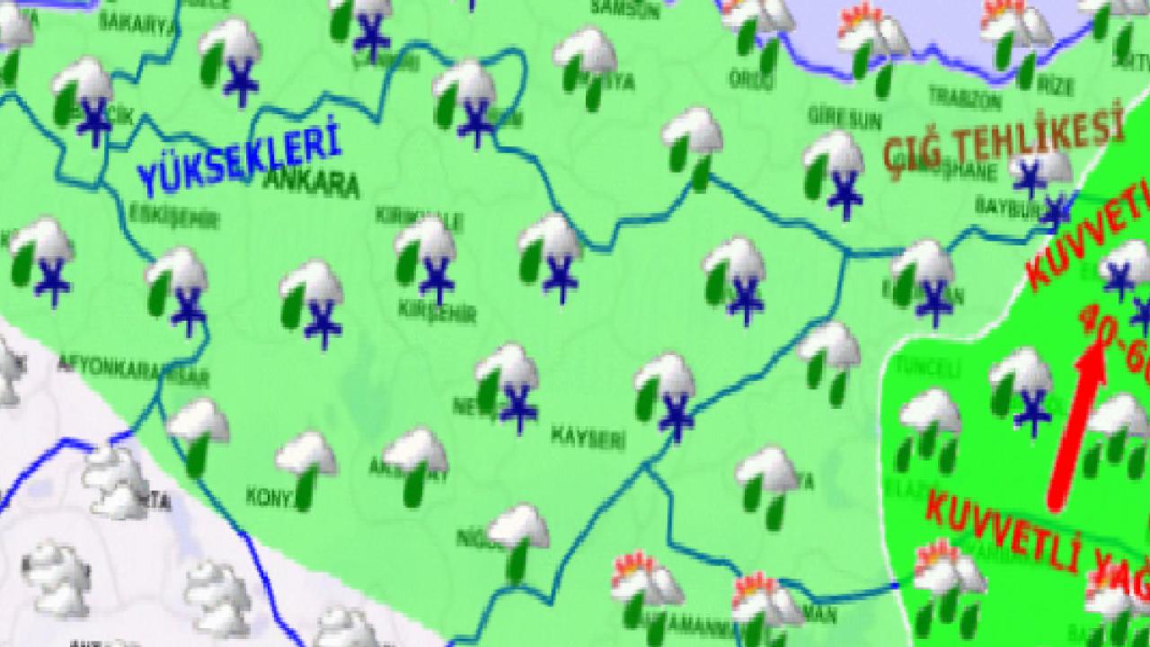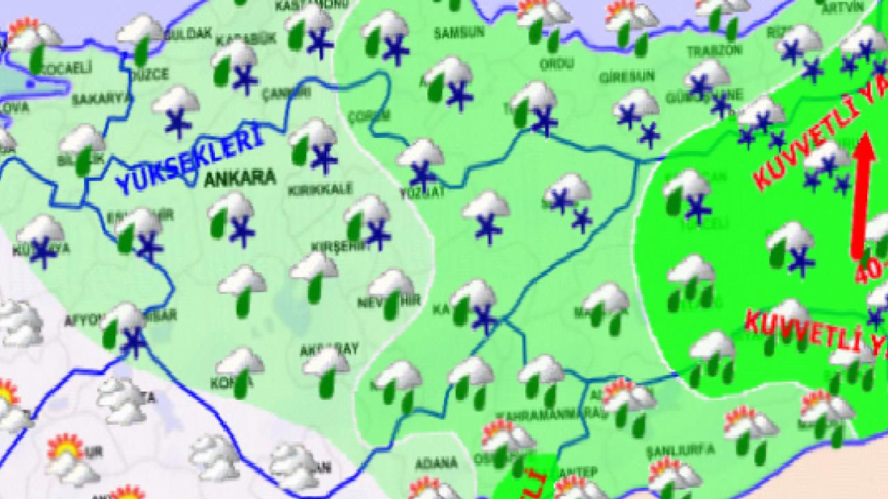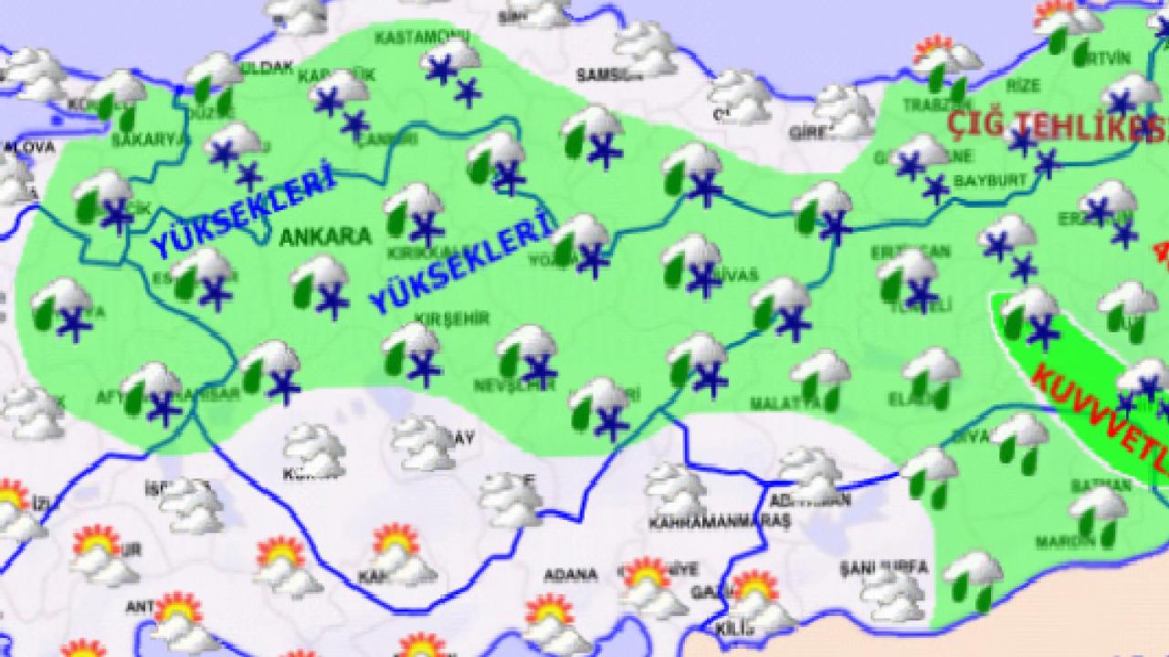 Marmara (Çanakkale hariç), Doğu Akdeniz, İç Anadolu, Karadeniz, Doğu ve Güneydoğu Anadolu ile Kütahya ve Afyonkarahisar çevrelerinde aralıklı yağış beklenirken yağışların genellikle yağmur ve sağanak, iç ve doğu kesimlerde ise karla karışık yağmur ve kar şeklinde görüleceği tahmin edildi. Doğu Anadolu (Malatya ve Iğdır hariç), Güneydoğu Anadolu’nun doğusu ile Osmaniye, Hatay ve Bayburt çevrelerinde yerel olarak kuvvetli olması öngörüldü.